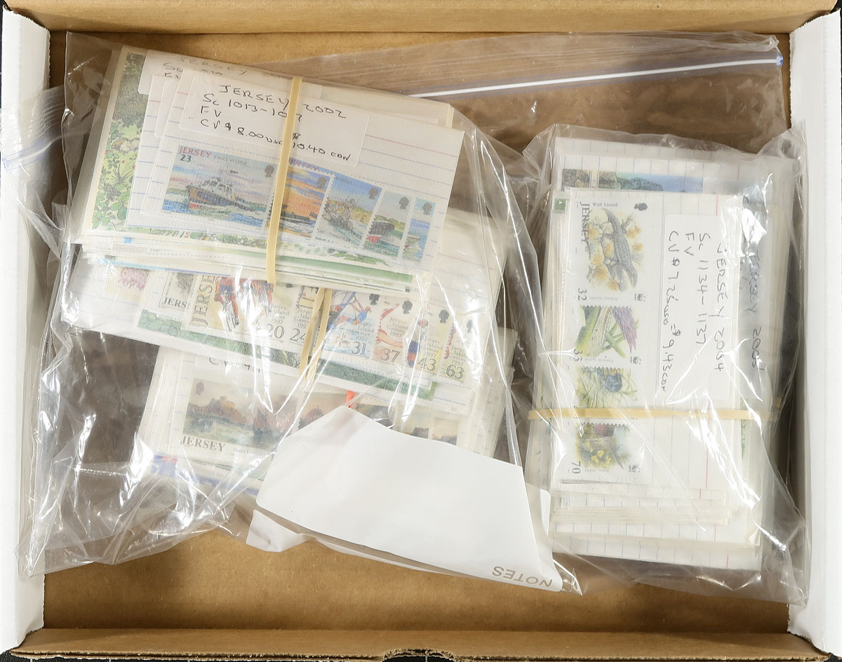 A "hit-or-miss" dealer stock (or collection builder) of mint never hinged issues from 1989-2010, very complete in some areas, sparse in others, with a few smaller format souvenir sheets. Most in small cards or glassines. In the early 2000's, Jersey substantially increased the new issue costs for collectors. Subsequently there are many collections missing this material and few dealer stocks with these issues. Five bundles here with a conservative 2024 Scott catalogue value US$1000.00 =