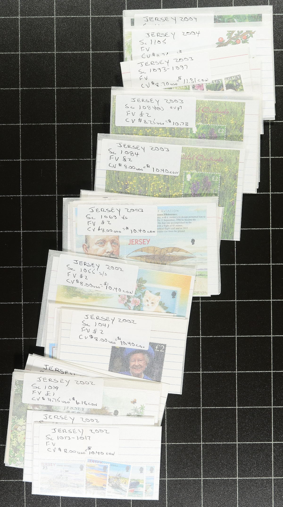 A "hit-or-miss" dealer stock (or collection builder) of mint never hinged issues from 1989-2010, very complete in some areas, sparse in others, with a few smaller format souvenir sheets. Most in small cards or glassines. In the early 2000's, Jersey substantially increased the new issue costs for collectors. Subsequently there are many collections missing this material and few dealer stocks with these issues. Five bundles here with a conservative 2024 Scott catalogue value US$1000.00 =