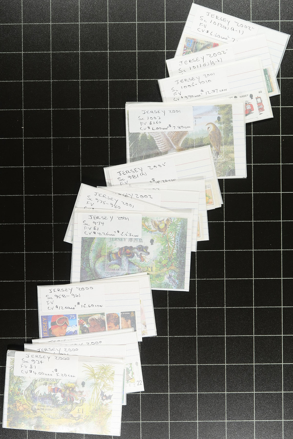 A "hit-or-miss" dealer stock (or collection builder) of mint never hinged issues from 1989-2010, very complete in some areas, sparse in others, with a few smaller format souvenir sheets. Most in small cards or glassines. In the early 2000's, Jersey substantially increased the new issue costs for collectors. Subsequently there are many collections missing this material and few dealer stocks with these issues. Five bundles here with a conservative 2024 Scott catalogue value US$1000.00 =