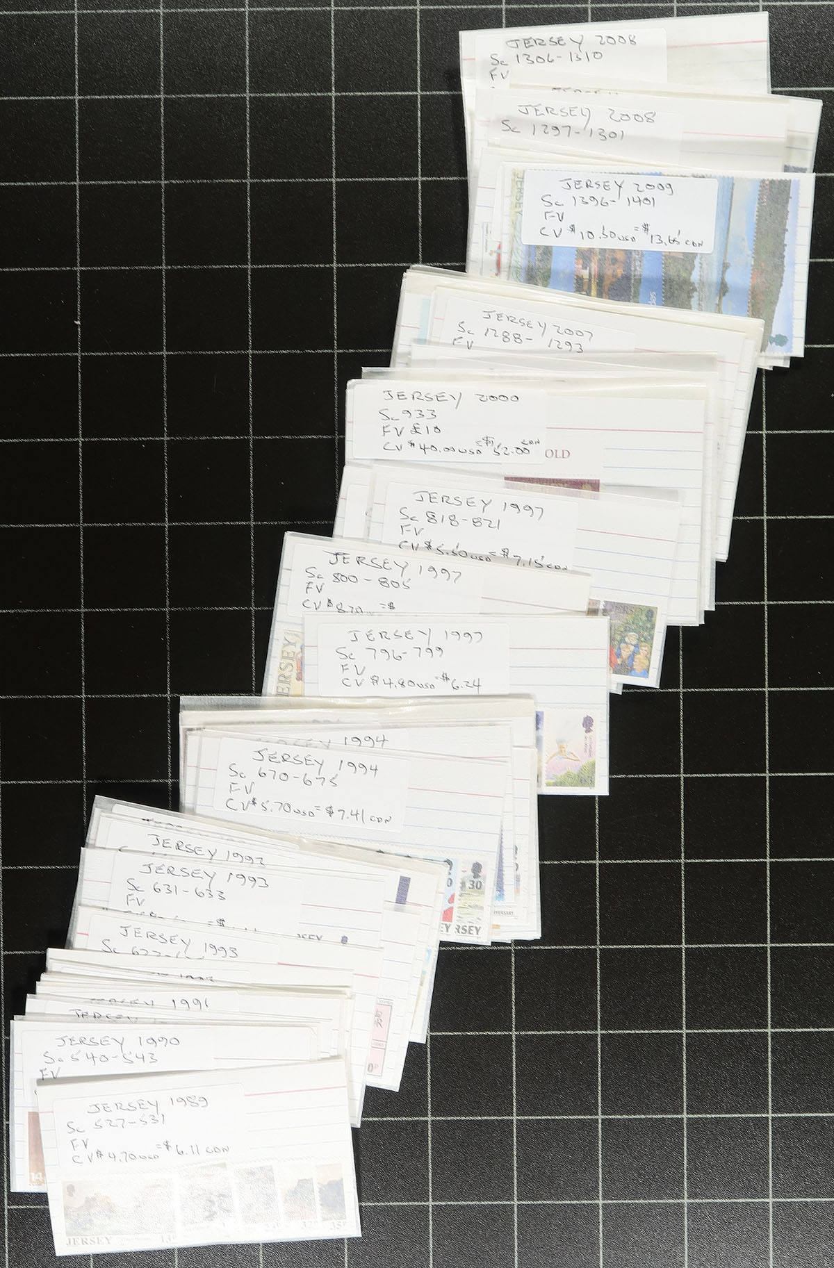 A "hit-or-miss" dealer stock (or collection builder) of mint never hinged issues from 1989-2010, very complete in some areas, sparse in others, with a few smaller format souvenir sheets. Most in small cards or glassines. In the early 2000's, Jersey substantially increased the new issue costs for collectors. Subsequently there are many collections missing this material and few dealer stocks with these issues. Five bundles here with a conservative 2024 Scott catalogue value US$1000.00 =