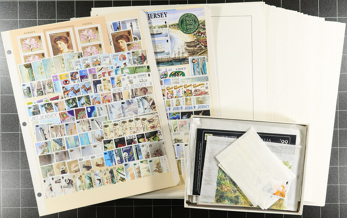 An assortment of mint never hinged Jersey, including hingeless Lindner album pages from 1969-1989, with about $125.00 catalogue value in stamps (pages alone retail $175.00)! Supplementing this collection are more recent sets and singles from 1986-1992 (with a bit of minor duplication) and another $250.00 in catalogue value. Estimate =