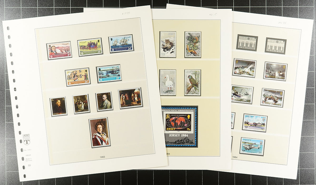 An assortment of mint never hinged Jersey, including hingeless Lindner album pages from 1969-1989, with about $125.00 catalogue value in stamps (pages alone retail $175.00)! Supplementing this collection are more recent sets and singles from 1986-1992 (with a bit of minor duplication) and another $250.00 in catalogue value. Estimate =