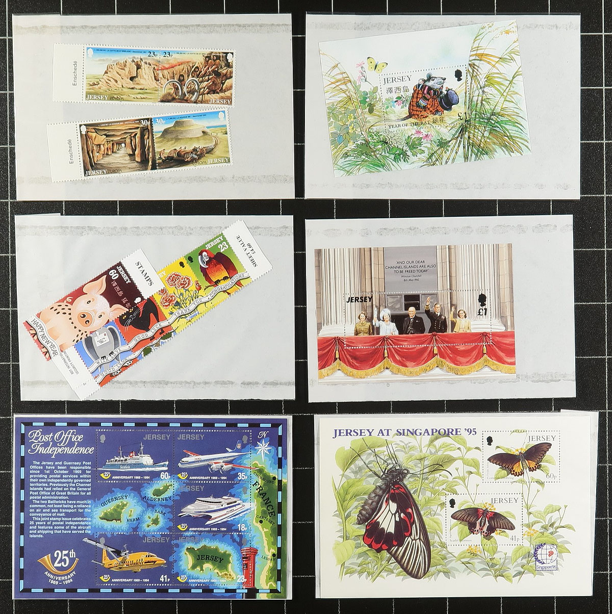 An assortment of mint never hinged Jersey, including hingeless Lindner album pages from 1969-1989, with about $125.00 catalogue value in stamps (pages alone retail $175.00)! Supplementing this collection are more recent sets and singles from 1986-1992 (with a bit of minor duplication) and another $250.00 in catalogue value. Estimate =