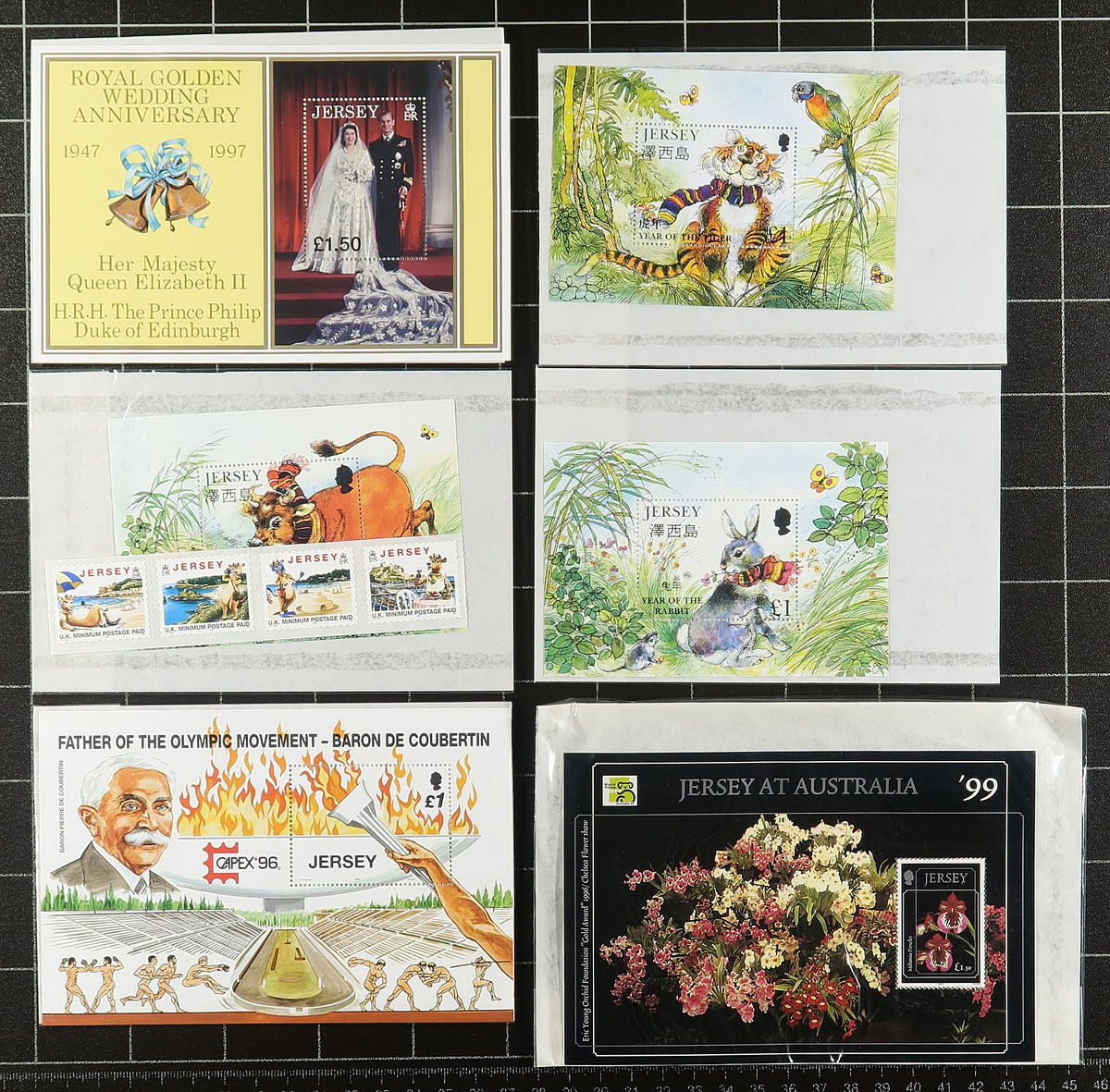 An assortment of mint never hinged Jersey, including hingeless Lindner album pages from 1969-1989, with about $125.00 catalogue value in stamps (pages alone retail $175.00)! Supplementing this collection are more recent sets and singles from 1986-1992 (with a bit of minor duplication) and another $250.00 in catalogue value. Estimate =