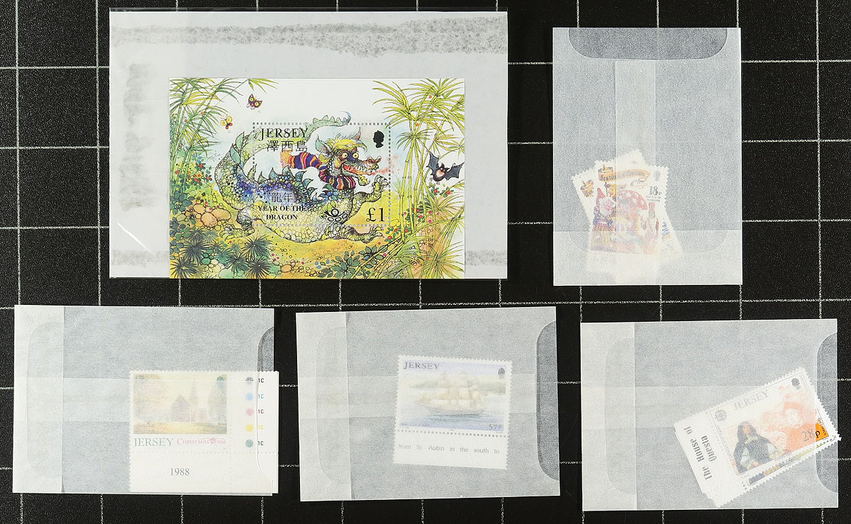 An assortment of mint never hinged Jersey, including hingeless Lindner album pages from 1969-1989, with about $125.00 catalogue value in stamps (pages alone retail $175.00)! Supplementing this collection are more recent sets and singles from 1986-1992 (with a bit of minor duplication) and another $250.00 in catalogue value. Estimate =