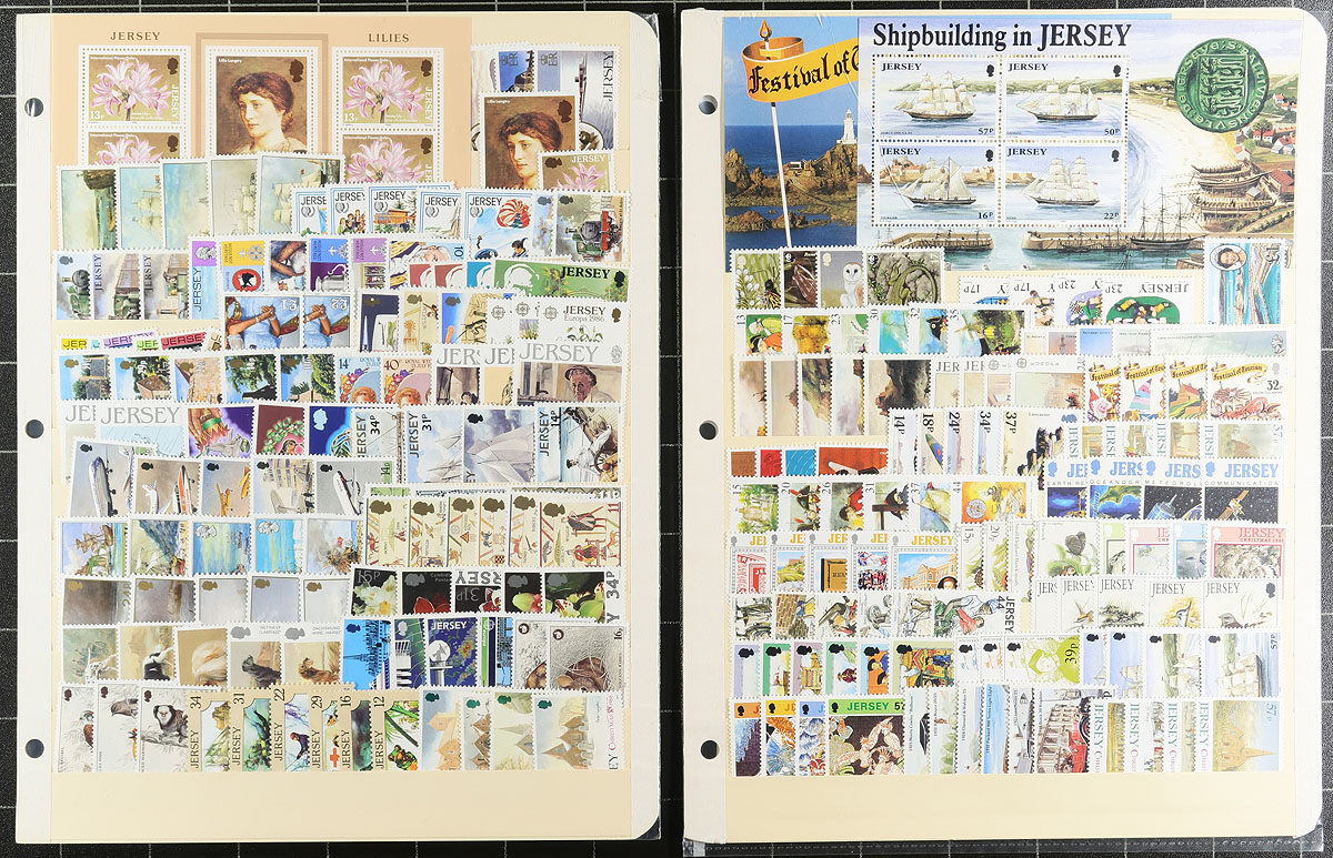 An assortment of mint never hinged Jersey, including hingeless Lindner album pages from 1969-1989, with about $125.00 catalogue value in stamps (pages alone retail $175.00)! Supplementing this collection are more recent sets and singles from 1986-1992 (with a bit of minor duplication) and another $250.00 in catalogue value. Estimate =