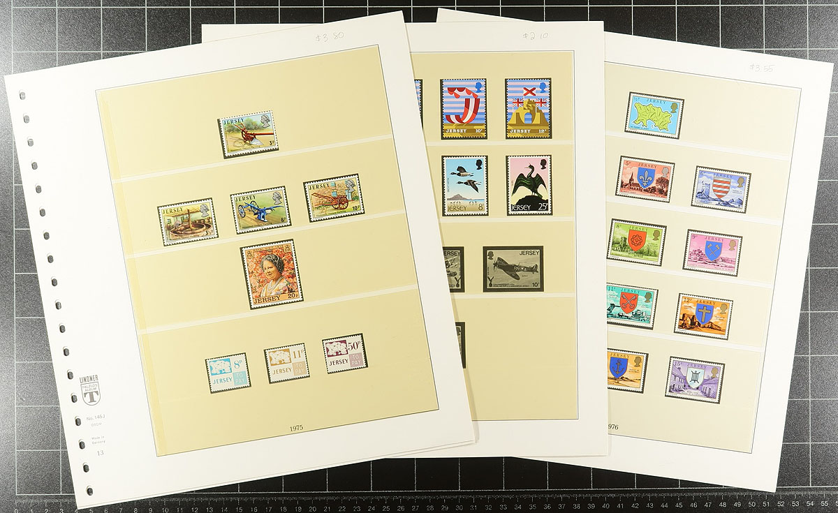 An assortment of mint never hinged Jersey, including hingeless Lindner album pages from 1969-1989, with about $125.00 catalogue value in stamps (pages alone retail $175.00)! Supplementing this collection are more recent sets and singles from 1986-1992 (with a bit of minor duplication) and another $250.00 in catalogue value. Estimate =