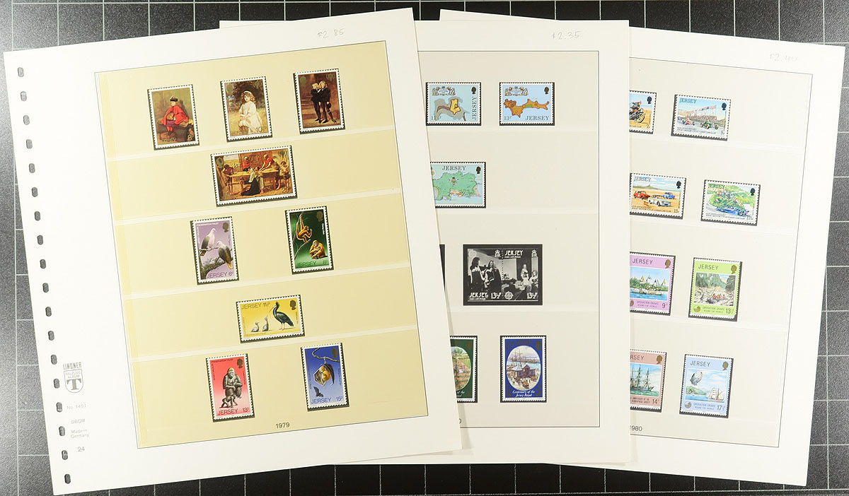 An assortment of mint never hinged Jersey, including hingeless Lindner album pages from 1969-1989, with about $125.00 catalogue value in stamps (pages alone retail $175.00)! Supplementing this collection are more recent sets and singles from 1986-1992 (with a bit of minor duplication) and another $250.00 in catalogue value. Estimate =