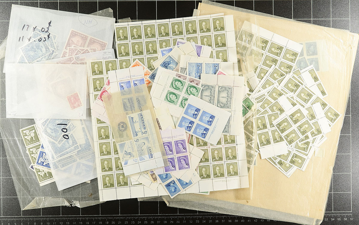 A bundle consisting of the balance of an estate. A bit of everything here, mostly 20th century, with a mix of mint (some is no gum), used, and a number of complete booklets. A couple of handfuls of album pages, some face value from the 4c-8c era (including a few plate blocks) have some value, plus there is some back of the book, a bit of cancel interest, and a smattering of retail cards. Don’t forget the bits of Newfoundland and the Maritime colonies. Estimate =