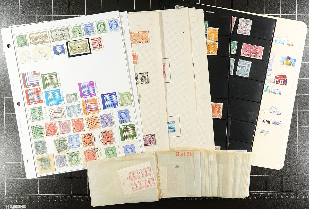 A bundle consisting of the balance of an estate. A bit of everything here, mostly 20th century, with a mix of mint (some is no gum), used, and a number of complete booklets. A couple of handfuls of album pages, some face value from the 4c-8c era (including a few plate blocks) have some value, plus there is some back of the book, a bit of cancel interest, and a smattering of retail cards. Don’t forget the bits of Newfoundland and the Maritime colonies. Estimate =