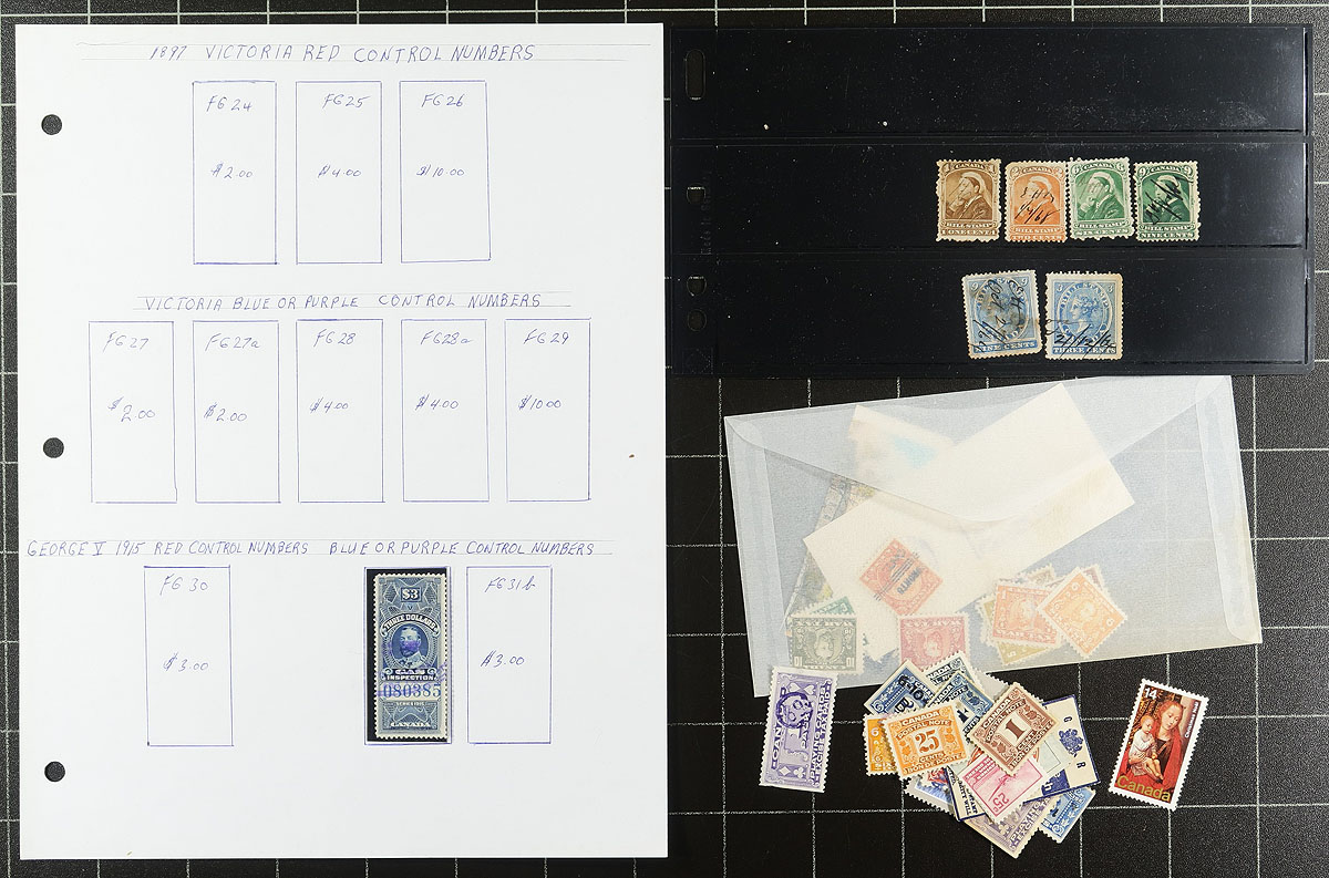 A mix of selected items and leftover album pages. There is a nice group of Telegraph stamps from BC Tel, Great North Western and CPR. A dozen Saskatchewan Power Commission stamps are all used. The pair of New Brunswick health booklet panes are mint, but with some faults. The balance of the lot is mostly Federal, with Inspection, Excise, War Tax, etc. A fun lot for exploring. Estimate =