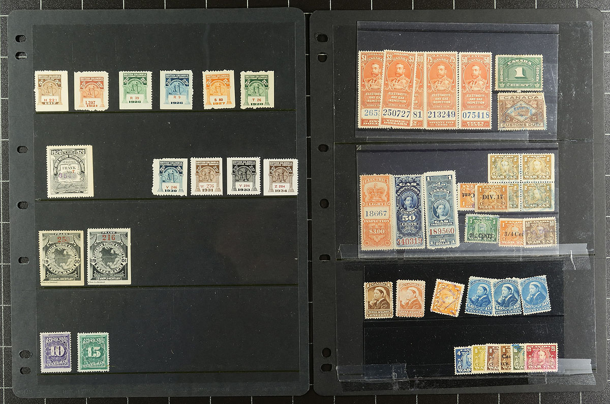 A mix of selected items and leftover album pages. There is a nice group of Telegraph stamps from BC Tel, Great North Western and CPR. A dozen Saskatchewan Power Commission stamps are all used. The pair of New Brunswick health booklet panes are mint, but with some faults. The balance of the lot is mostly Federal, with Inspection, Excise, War Tax, etc. A fun lot for exploring. Estimate =