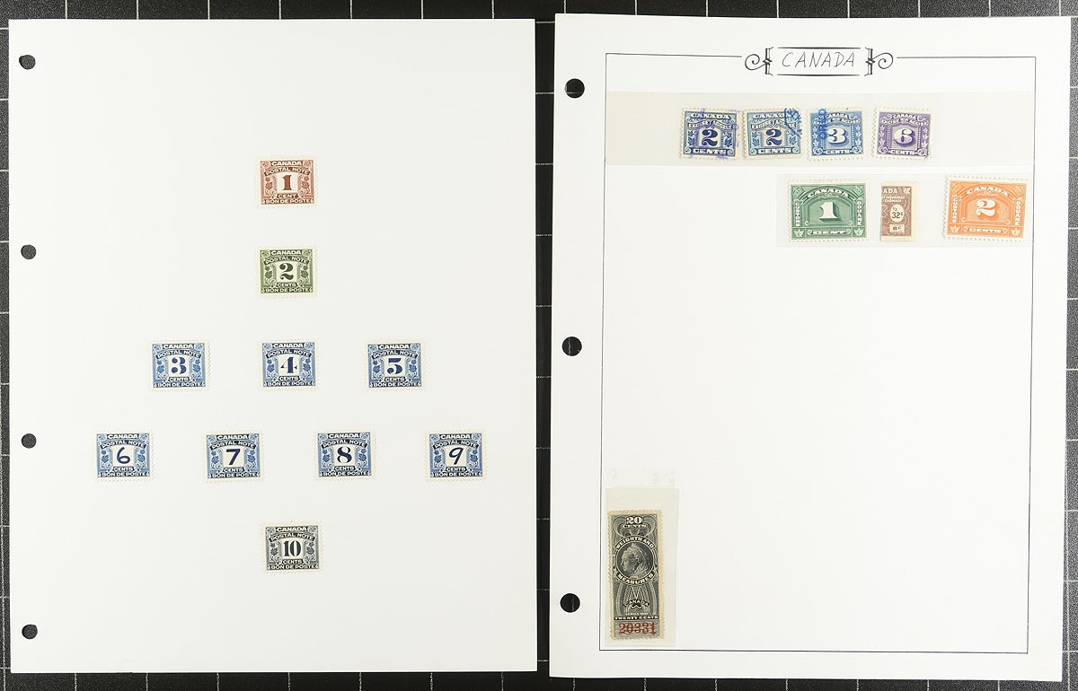 A mix of selected items and leftover album pages. There is a nice group of Telegraph stamps from BC Tel, Great North Western and CPR. A dozen Saskatchewan Power Commission stamps are all used. The pair of New Brunswick health booklet panes are mint, but with some faults. The balance of the lot is mostly Federal, with Inspection, Excise, War Tax, etc. A fun lot for exploring. Estimate =