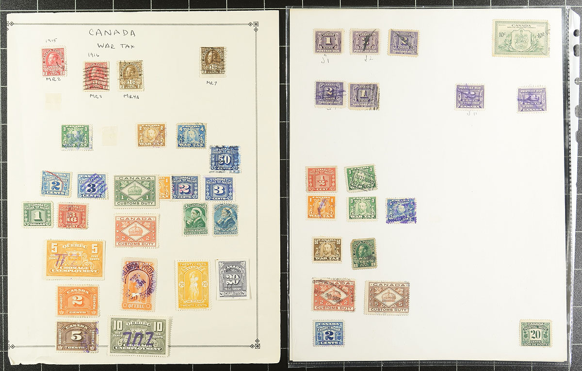 A mix of selected items and leftover album pages. There is a nice group of Telegraph stamps from BC Tel, Great North Western and CPR. A dozen Saskatchewan Power Commission stamps are all used. The pair of New Brunswick health booklet panes are mint, but with some faults. The balance of the lot is mostly Federal, with Inspection, Excise, War Tax, etc. A fun lot for exploring. Estimate =