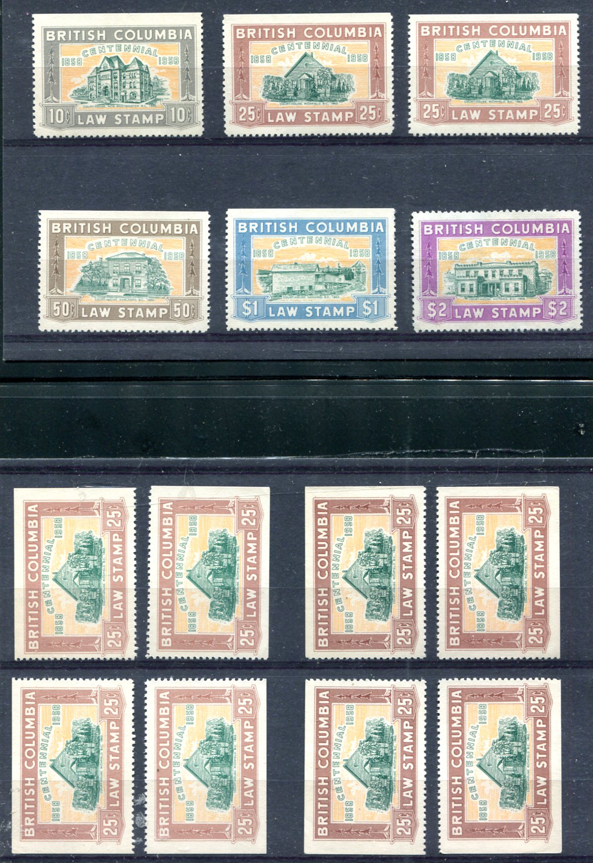 British Columbia Centennial issue mint law stamps from 1958, with a basic set (the $2.00 has no gum) and the 25c comes in two shades. Additionally, the 25c #BCL47 comes with 8 additional copies (4 in each shade), with a copy from each corner of the sheet. A mix of hinged and never hinged. 2022 van Dam =