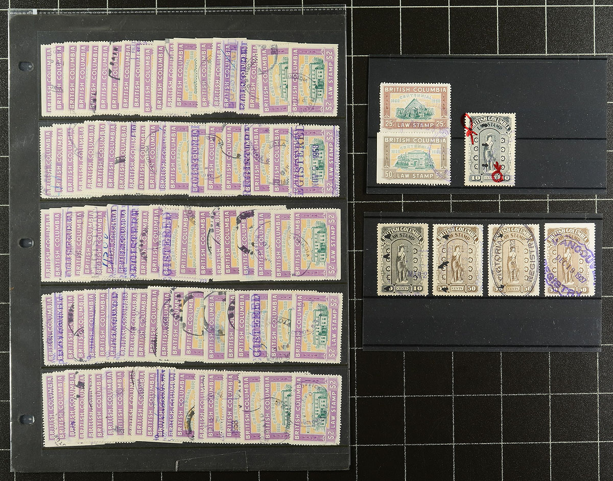 Used wholesale group of assorted BC Law stamps, with a half dozen copies from the 1912-1926 series (need to be checked for minor varieties). Includes a copy of the 25c and 50c 1958 Centennial issue and finishes with wholesale lot of 100 copies of the $2.00 Centennial. Usual mixed condition and should make for a good study lot. 2022 van Dam =