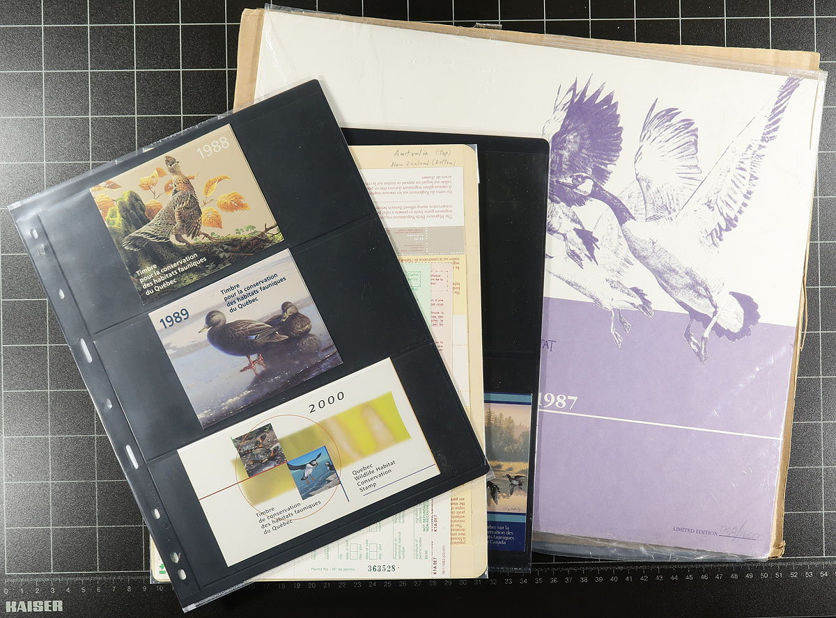 Not your usual animal revenue group. There awesome duck stamps, with a trio from Quebec (#QW1, 2, 13), and an octet from Canada (#FWH1-5, FWH12-14), these catalogue $390.00. There is a small group with the six "Prairie Conservation" birds, a Winnipeg Canada Goose, three fish license stamps, plus one used license, one unused with stamp, and another mint form. Finally, there is a 1987 limited edition print (#938/16,000) of the design for #FWH3 (11th edition Darnell retail (#D-3-print) $250.00)! Estimate =