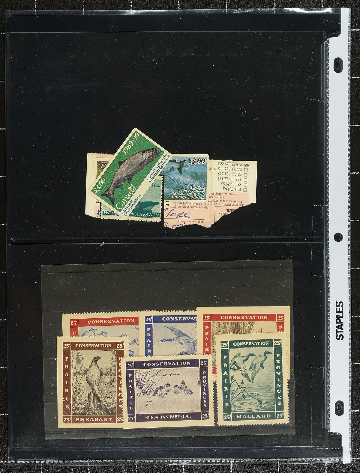 Not your usual animal revenue group. There awesome duck stamps, with a trio from Quebec (#QW1, 2, 13), and an octet from Canada (#FWH1-5, FWH12-14), these catalogue $390.00. There is a small group with the six "Prairie Conservation" birds, a Winnipeg Canada Goose, three fish license stamps, plus one used license, one unused with stamp, and another mint form. Finally, there is a 1987 limited edition print (#938/16,000) of the design for #FWH3 (11th edition Darnell retail (#D-3-print) $250.00)! Estimate =