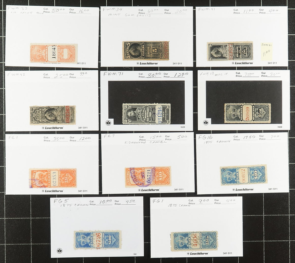 This small group starts with an Ontario Law stamp duo, but is mostly Federal afterwards including a batch of Federal Inspection stamps on "102" cards (cat $337.50), a nice piece with Excise stamps (cat $208.50), a Supreme Court 25c QV 1876 on piece (cat $175.00), plus a UIC booklet with 20 stamps a couple of ledger pages of Excise stamps and a small envelope with unchecked loose issues. Usual mixed condition. Estimate =