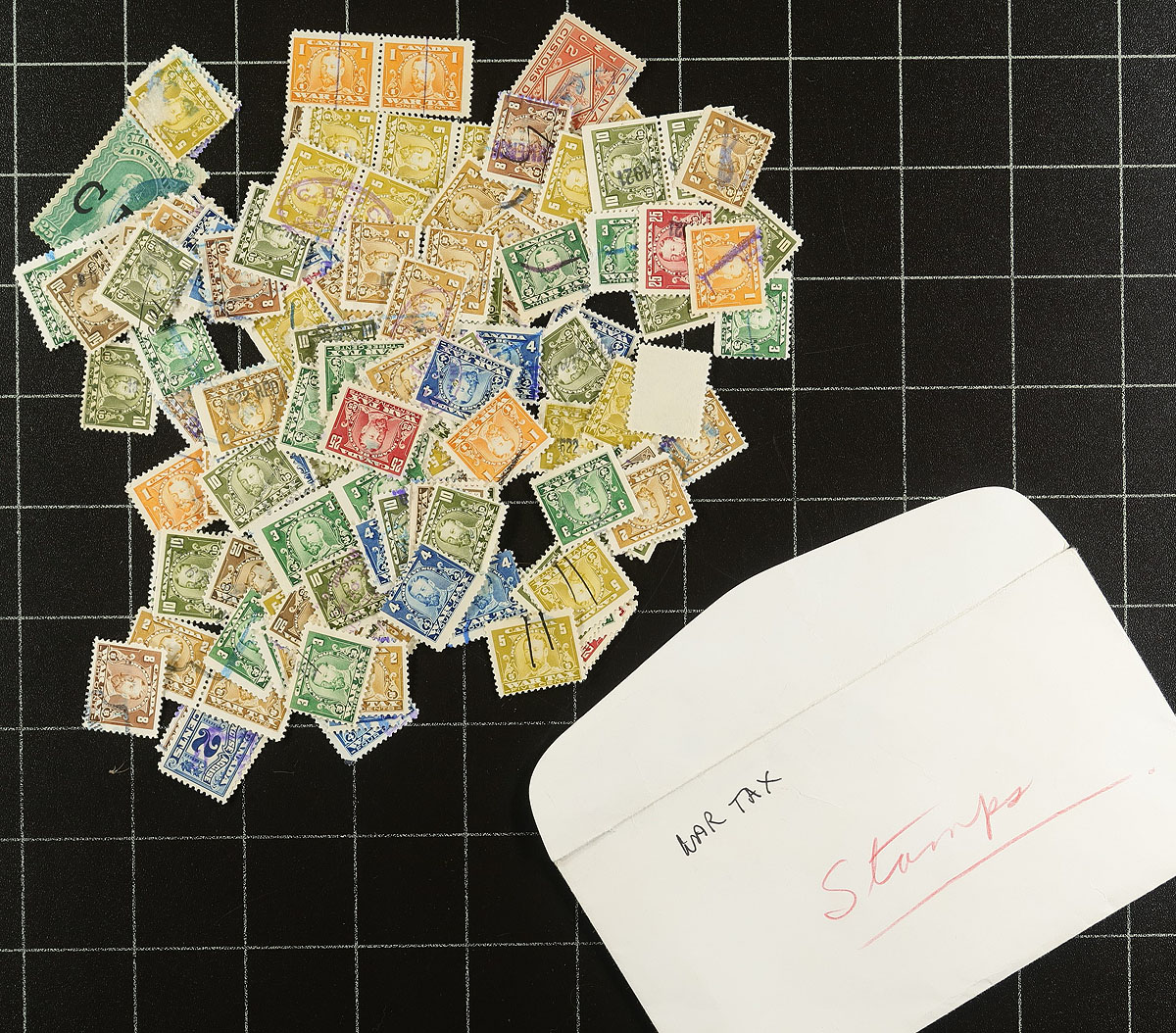 This small group starts with an Ontario Law stamp duo, but is mostly Federal afterwards including a batch of Federal Inspection stamps on "102" cards (cat $337.50), a nice piece with Excise stamps (cat $208.50), a Supreme Court 25c QV 1876 on piece (cat $175.00), plus a UIC booklet with 20 stamps a couple of ledger pages of Excise stamps and a small envelope with unchecked loose issues. Usual mixed condition. Estimate =