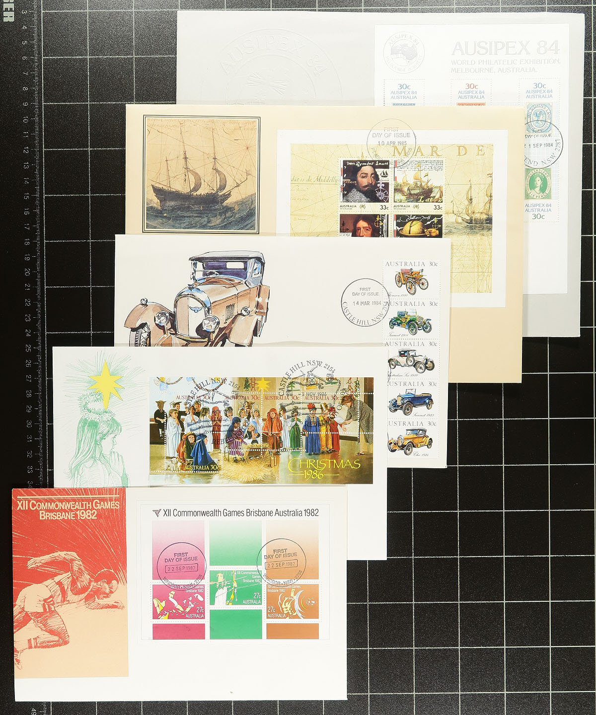 First Day Covers, postal stationery, stationery view cards & commemorative cancel packs, almost all 1970's-1980's. A total of 300+ items, including the six packs of commemorative cancels from the 1988 Brisbane Commonwealth Games (face value A$75.00). The first day covers are all unaddressed with AustraliaPost cachets, face values to $10.00 and some souvenir sheets. The stationery is both mint and first day cancelled. Finishes with four sets of the "Maxi-card" postal card folders (red, blue, black, brown). Lots of original cost here. Estimate =