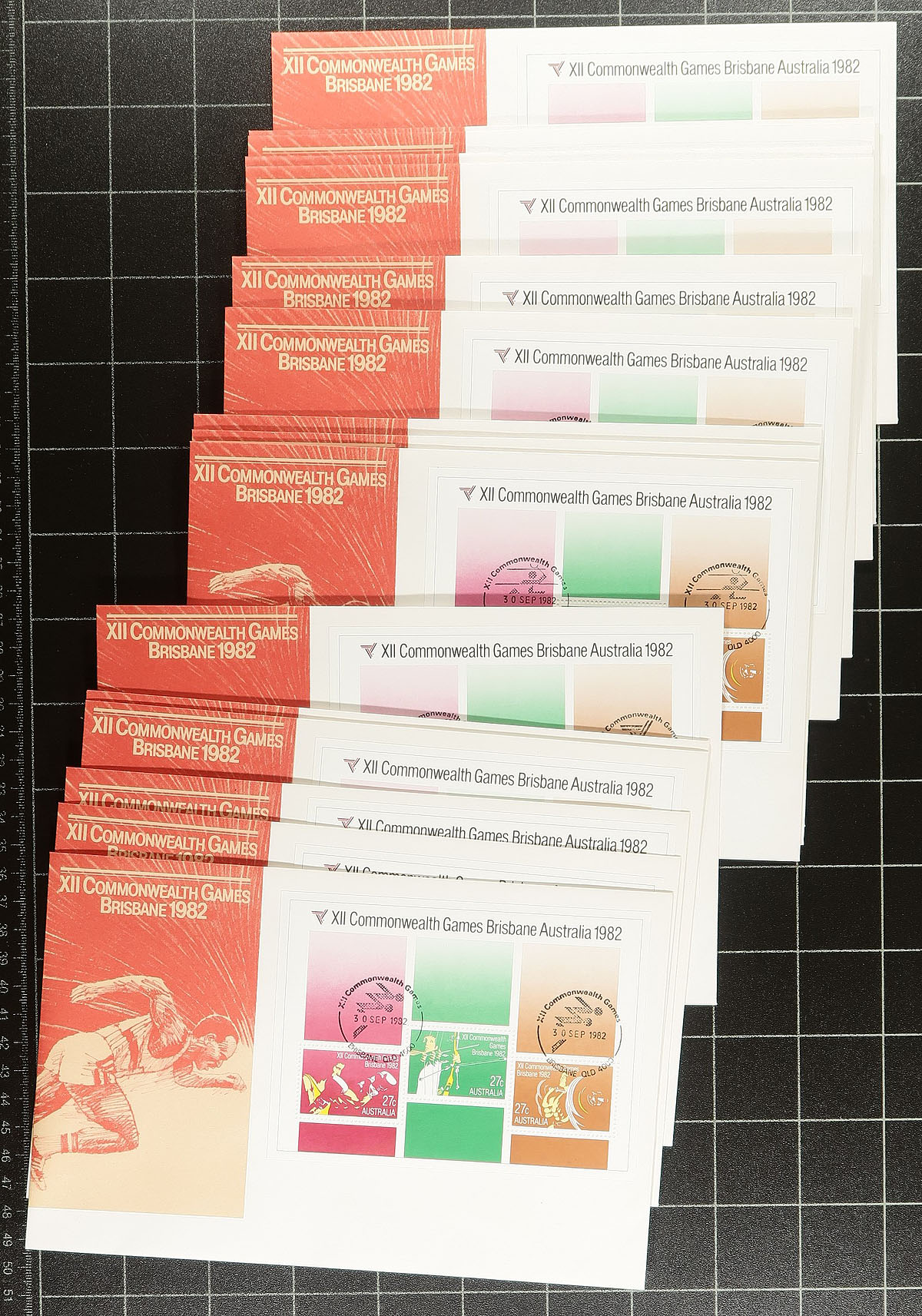 First Day Covers, postal stationery, stationery view cards & commemorative cancel packs, almost all 1970's-1980's. A total of 300+ items, including the six packs of commemorative cancels from the 1988 Brisbane Commonwealth Games (face value A$75.00). The first day covers are all unaddressed with AustraliaPost cachets, face values to $10.00 and some souvenir sheets. The stationery is both mint and first day cancelled. Finishes with four sets of the "Maxi-card" postal card folders (red, blue, black, brown). Lots of original cost here. Estimate =