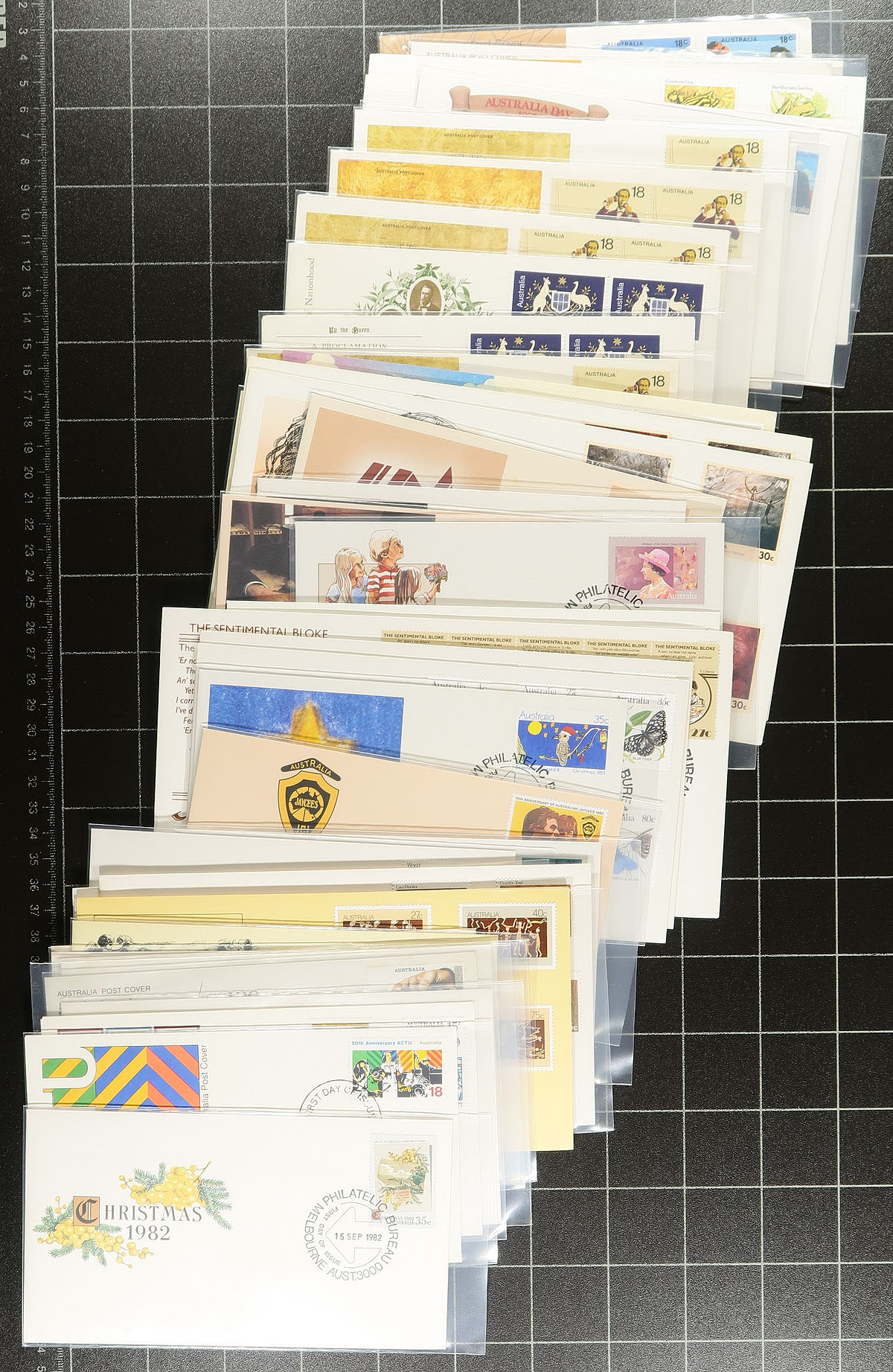 First Day Covers, postal stationery, stationery view cards & commemorative cancel packs, almost all 1970's-1980's. A total of 300+ items, including the six packs of commemorative cancels from the 1988 Brisbane Commonwealth Games (face value A$75.00). The first day covers are all unaddressed with AustraliaPost cachets, face values to $10.00 and some souvenir sheets. The stationery is both mint and first day cancelled. Finishes with four sets of the "Maxi-card" postal card folders (red, blue, black, brown). Lots of original cost here. Estimate =