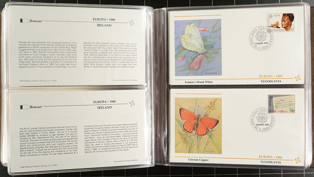 Europa First Day Cover annual collections produced by Fleetwood, which appear to be complete. Includes 3-tall specialty albums with 59 different 1978-1979 FDC's. Another duo with a different style of album (and different cachets) covers 1979 (30 FDC's) and 1980 (57 FDCs) - the album covers of these two are a bit rough. From a similar series, but with "silk" cachets are the 1985 and 1986 sets (134 different). The caboose of this lot is a small assortment of 1961-1992 FDCs and maxi-cards including some less common material. About 300 items in total, filling a bankers box. Original cost would have been easily US$1500.00. Estimate =