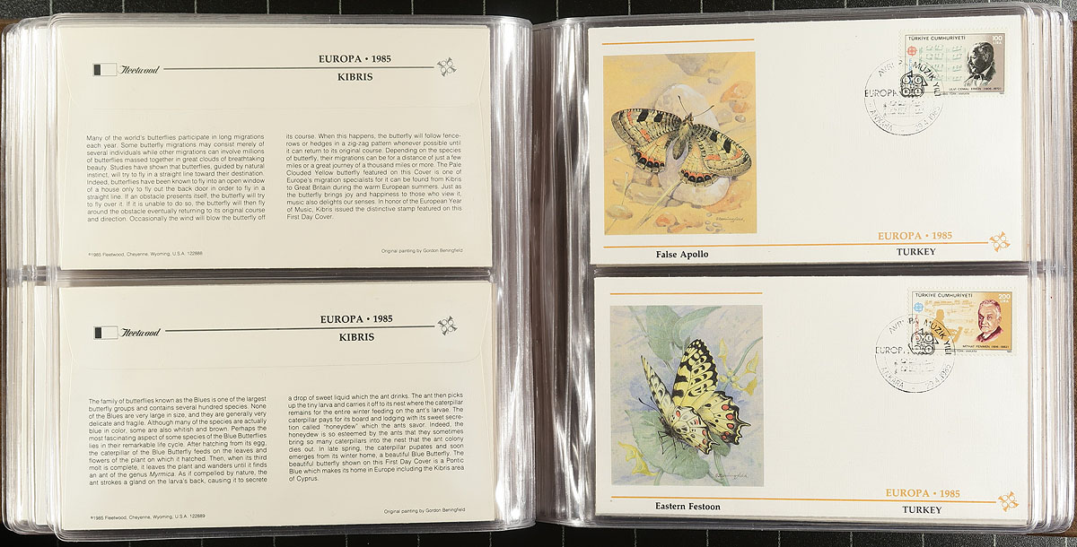 Europa First Day Cover annual collections produced by Fleetwood, which appear to be complete. Includes 3-tall specialty albums with 59 different 1978-1979 FDC's. Another duo with a different style of album (and different cachets) covers 1979 (30 FDC's) and 1980 (57 FDCs) - the album covers of these two are a bit rough. From a similar series, but with "silk" cachets are the 1985 and 1986 sets (134 different). The caboose of this lot is a small assortment of 1961-1992 FDCs and maxi-cards including some less common material. About 300 items in total, filling a bankers box. Original cost would have been easily US$1500.00. Estimate =