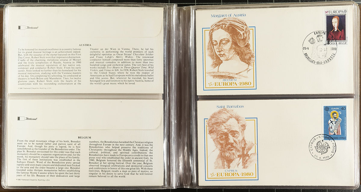 Europa First Day Cover annual collections produced by Fleetwood, which appear to be complete. Includes 3-tall specialty albums with 59 different 1978-1979 FDC's. Another duo with a different style of album (and different cachets) covers 1979 (30 FDC's) and 1980 (57 FDCs) - the album covers of these two are a bit rough. From a similar series, but with "silk" cachets are the 1985 and 1986 sets (134 different). The caboose of this lot is a small assortment of 1961-1992 FDCs and maxi-cards including some less common material. About 300 items in total, filling a bankers box. Original cost would have been easily US$1500.00. Estimate =