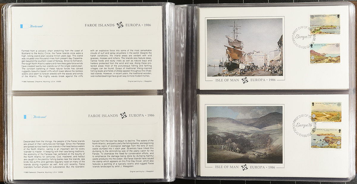 Europa First Day Cover annual collections produced by Fleetwood, which appear to be complete. Includes 3-tall specialty albums with 59 different 1978-1979 FDC's. Another duo with a different style of album (and different cachets) covers 1979 (30 FDC's) and 1980 (57 FDCs) - the album covers of these two are a bit rough. From a similar series, but with "silk" cachets are the 1985 and 1986 sets (134 different). The caboose of this lot is a small assortment of 1961-1992 FDCs and maxi-cards including some less common material. About 300 items in total, filling a bankers box. Original cost would have been easily US$1500.00. Estimate =