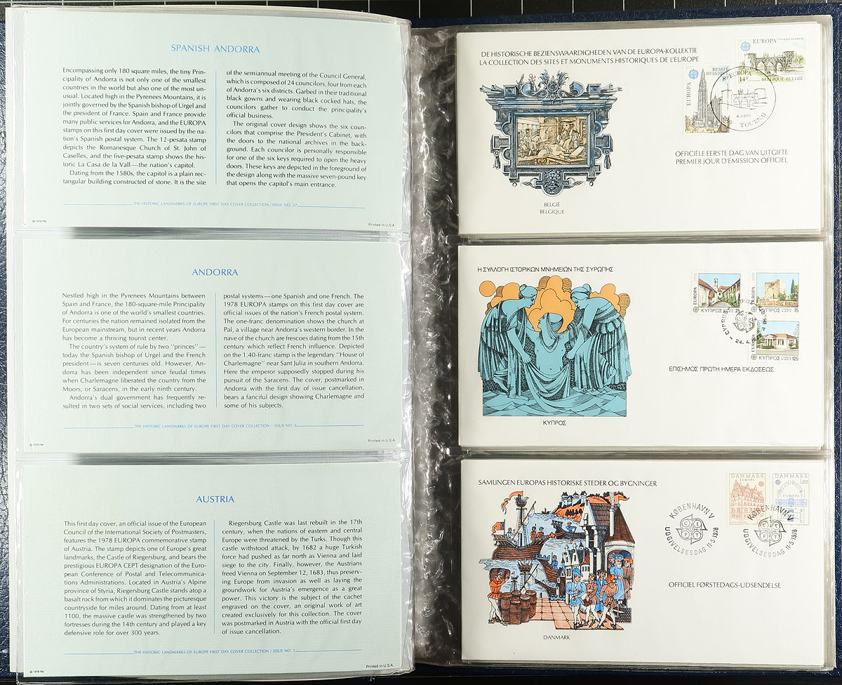 Europa First Day Cover annual collections produced by Fleetwood, which appear to be complete. Includes 3-tall specialty albums with 59 different 1978-1979 FDC's. Another duo with a different style of album (and different cachets) covers 1979 (30 FDC's) and 1980 (57 FDCs) - the album covers of these two are a bit rough. From a similar series, but with "silk" cachets are the 1985 and 1986 sets (134 different). The caboose of this lot is a small assortment of 1961-1992 FDCs and maxi-cards including some less common material. About 300 items in total, filling a bankers box. Original cost would have been easily US$1500.00. Estimate =