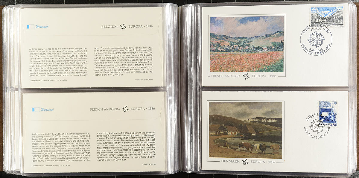Europa First Day Cover annual collections produced by Fleetwood, which appear to be complete. Includes 3-tall specialty albums with 59 different 1978-1979 FDC's. Another duo with a different style of album (and different cachets) covers 1979 (30 FDC's) and 1980 (57 FDCs) - the album covers of these two are a bit rough. From a similar series, but with "silk" cachets are the 1985 and 1986 sets (134 different). The caboose of this lot is a small assortment of 1961-1992 FDCs and maxi-cards including some less common material. About 300 items in total, filling a bankers box. Original cost would have been easily US$1500.00. Estimate =