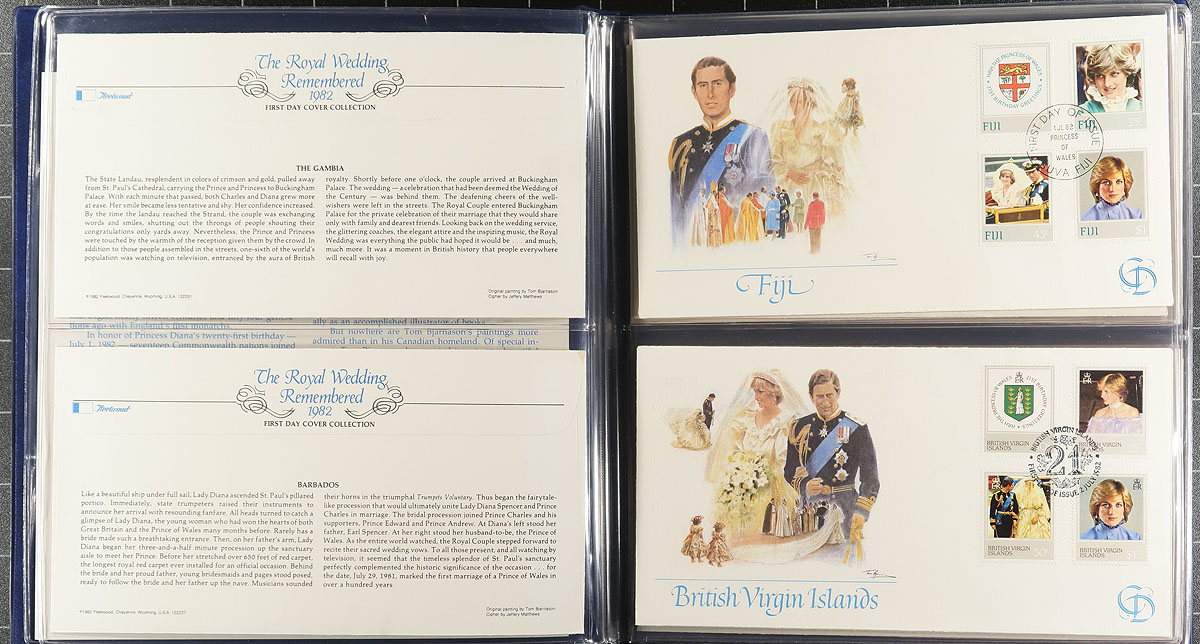Five different topical collections in a bankers box, mostly First Day Covers. Stanley Gibbons-produced album for 1964 Shakespeare celebration, followed by a two-volume 1981 "Charles and Diana" Royal Wedding. Three Olympic Games are represented with 1980 Summer (Paramount), 1984 box collection (Fleetwood), 2000 Sydney (Australia Post Prestige Collection). Substantial original cost. Estimate =