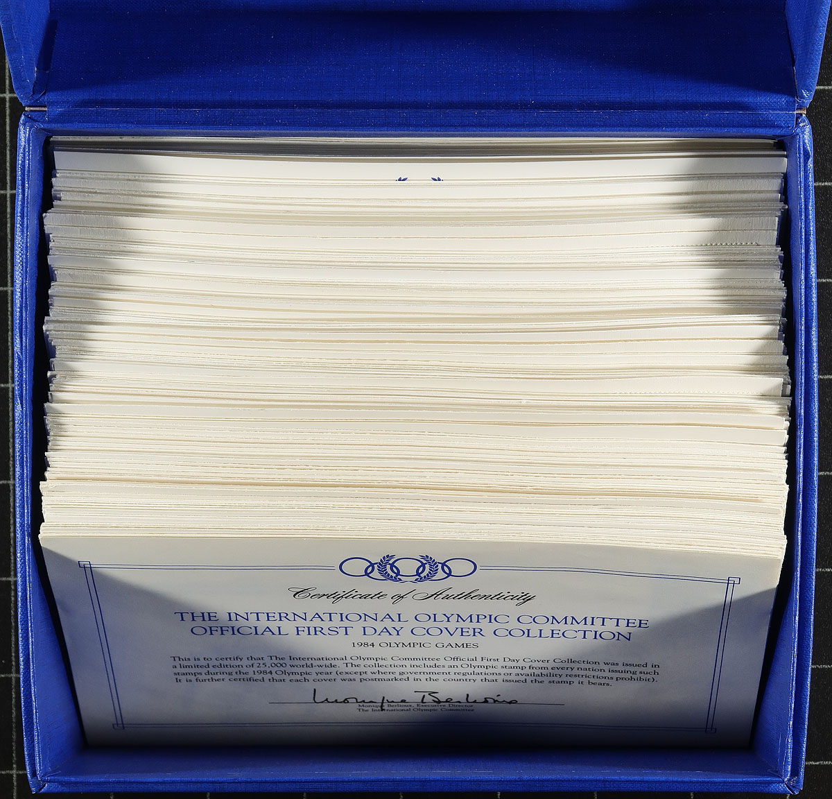 Five different topical collections in a bankers box, mostly First Day Covers. Stanley Gibbons-produced album for 1964 Shakespeare celebration, followed by a two-volume 1981 "Charles and Diana" Royal Wedding. Three Olympic Games are represented with 1980 Summer (Paramount), 1984 box collection (Fleetwood), 2000 Sydney (Australia Post Prestige Collection). Substantial original cost. Estimate =