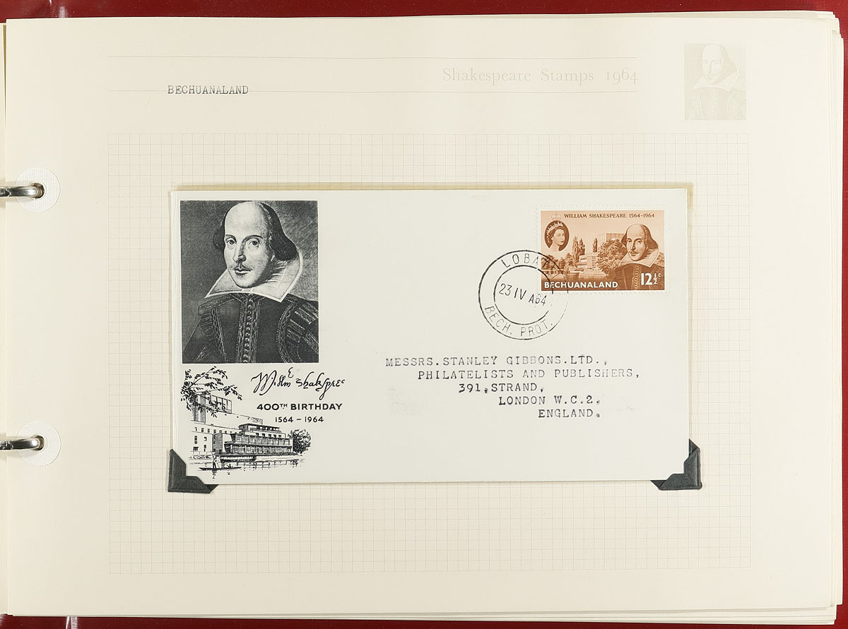 Five different topical collections in a bankers box, mostly First Day Covers. Stanley Gibbons-produced album for 1964 Shakespeare celebration, followed by a two-volume 1981 "Charles and Diana" Royal Wedding. Three Olympic Games are represented with 1980 Summer (Paramount), 1984 box collection (Fleetwood), 2000 Sydney (Australia Post Prestige Collection). Substantial original cost. Estimate =