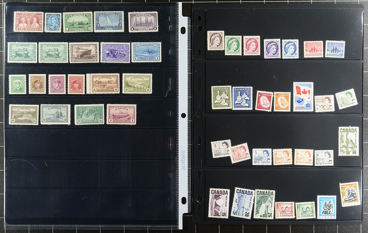 Over a century of assorted mint singles and a couple of sets, from Queen Victoria into the 1980's. This is the balance of an estate, and we have amalgamated some material, and left others on their original pages. While the appearance is generally good, there is a wide range of condition on the back, from hinge remnants to never hinged (and a couple which have no gum). There is a bit of lower denomination Queen Victoria to King George V with some coils (singles and pairs), The Medallion, Silver Jubilee and Peace sets, plus the higher values from the "War" issue. There is some Elizabethan material including Centennial blocks, Winnipeg tags. Estimate =