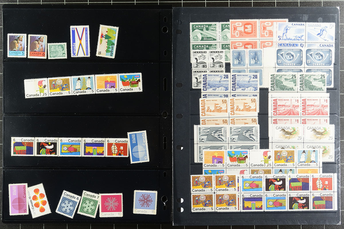 Over a century of assorted mint singles and a couple of sets, from Queen Victoria into the 1980's. This is the balance of an estate, and we have amalgamated some material, and left others on their original pages. While the appearance is generally good, there is a wide range of condition on the back, from hinge remnants to never hinged (and a couple which have no gum). There is a bit of lower denomination Queen Victoria to King George V with some coils (singles and pairs), The Medallion, Silver Jubilee and Peace sets, plus the higher values from the "War" issue. There is some Elizabethan material including Centennial blocks, Winnipeg tags. Estimate =