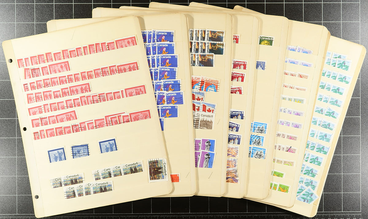 Used manila stockpages, 270 of them in a wide range of conditions, most have stamps in them, from a few to a few hundred. Obvious sections include Australia, Canada, Great Britain, United States and there is a fascinating group of pre-Elizabethan British Commonwealth. Overall, most are 20th century, with a bit earlier than that. Huge retail in the pages, lots of value in the stamps! Estimate based on the pages only. Estimate =