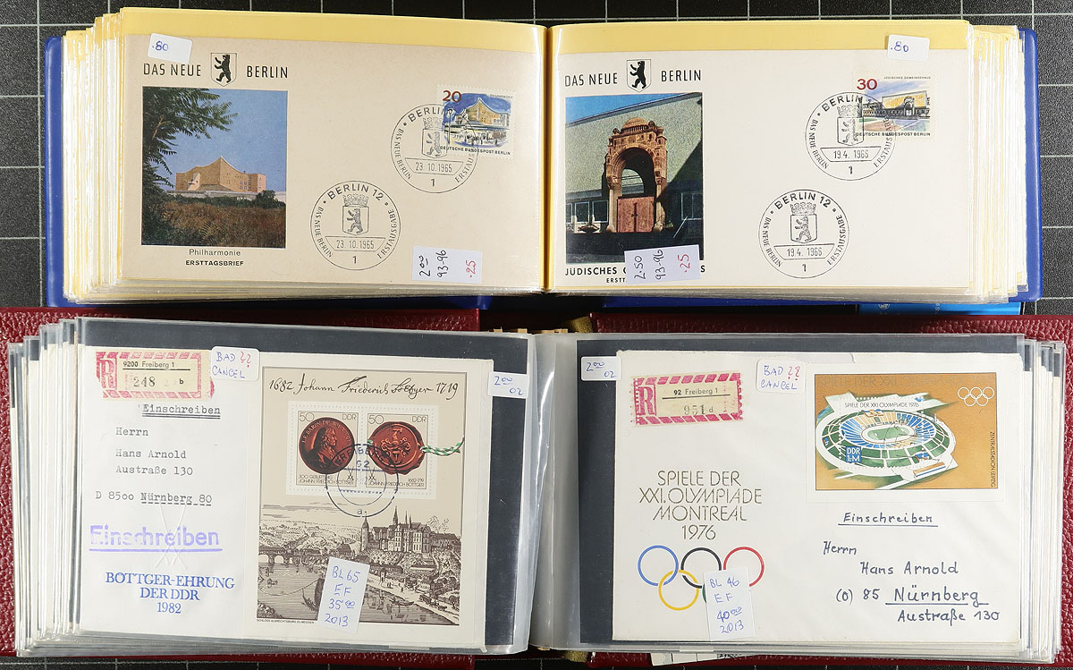 Post-war cover accumulation from West Germany, Berlin and East Germany, mostly 1960's-1990's. Lots of philatelic originating material with first day covers or commemorative cancels, in a quartet of cover albums and a few loose pages (includes some oversize items). A good mix, with little, if any, duplication. Includes better throughout. This material was bought from an auction, and left intact. The material originally was estimated at $300.00 PLUS some of the DDR and Berlin was catalogued a decade ago at over €1,000.00! Estimate =