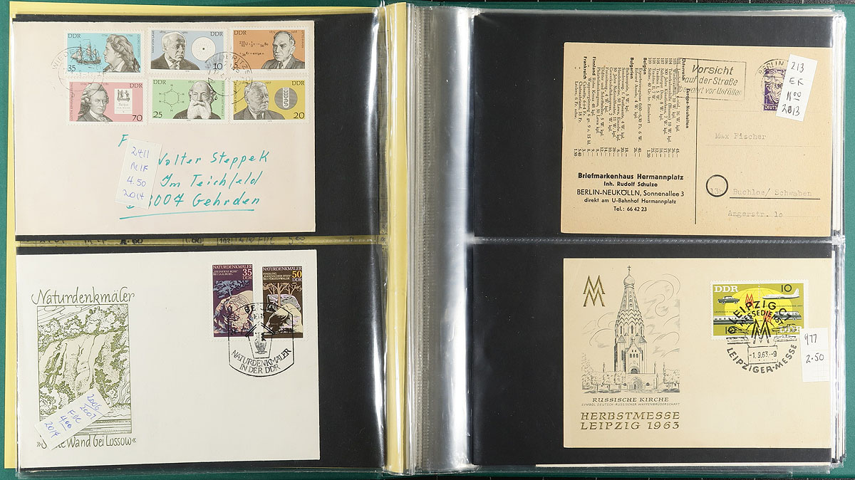 Post-war cover accumulation from West Germany, Berlin and East Germany, mostly 1960's-1990's. Lots of philatelic originating material with first day covers or commemorative cancels, in a quartet of cover albums and a few loose pages (includes some oversize items). A good mix, with little, if any, duplication. Includes better throughout. This material was bought from an auction, and left intact. The material originally was estimated at $300.00 PLUS some of the DDR and Berlin was catalogued a decade ago at over €1,000.00! Estimate =
