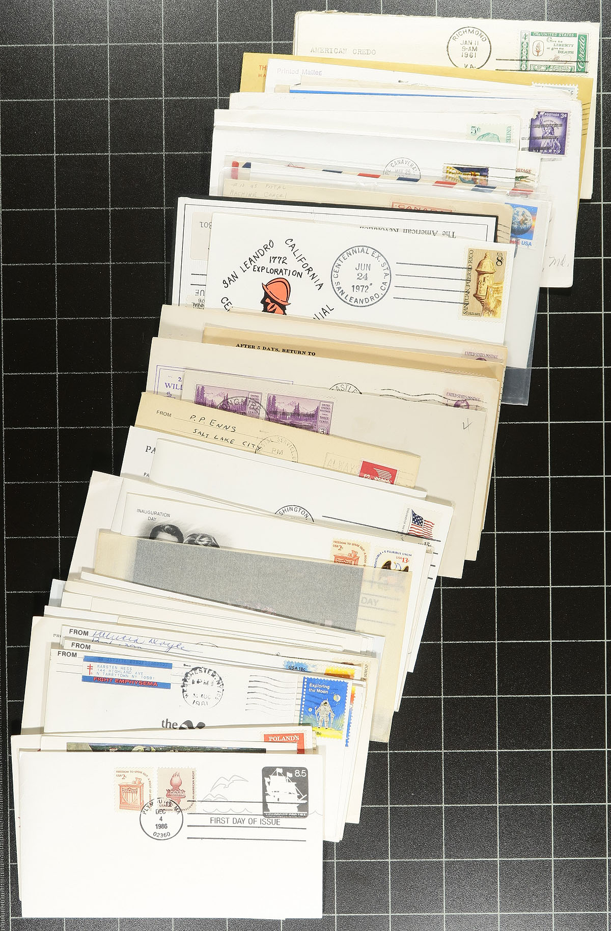 Accumulation of roughly 500 covers in a box, the vast majority being first day covers ranging from the 1940's to the 1980's, noting some private cachets, along with event covers, space covers, commercial covers (many from from the 1870's franked with the 3c Washington (Banknote perhaps) issue, paying the domestic rate), postal stationery, etc. A nice group for the cover collector, a few faults mostly with the commercial mail, overall fine to very fine. Estimate =