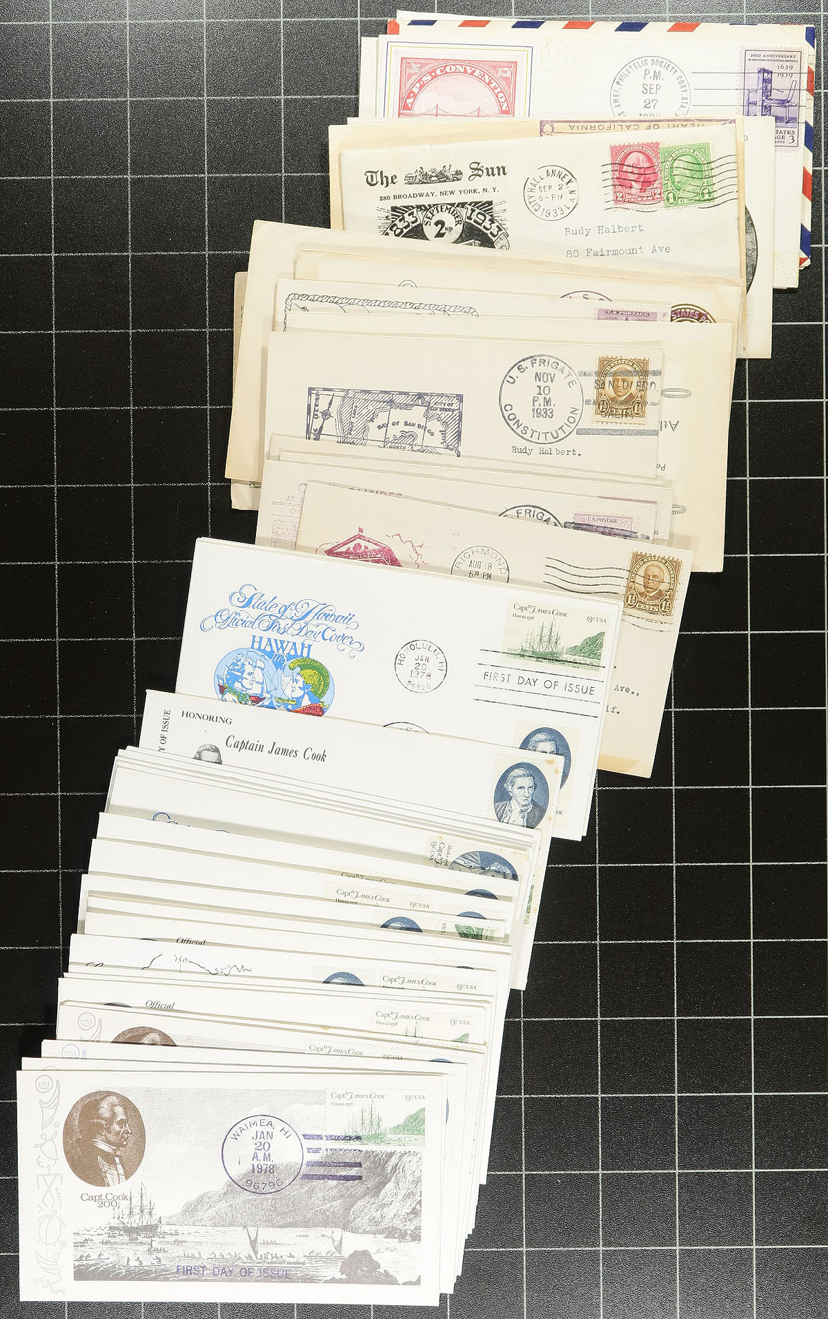 Accumulation of roughly 500 covers in a box, the vast majority being first day covers ranging from the 1940's to the 1980's, noting some private cachets, along with event covers, space covers, commercial covers (many from from the 1870's franked with the 3c Washington (Banknote perhaps) issue, paying the domestic rate), postal stationery, etc. A nice group for the cover collector, a few faults mostly with the commercial mail, overall fine to very fine. Estimate =