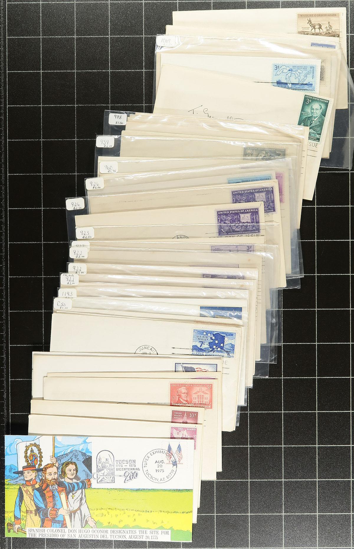 Accumulation of roughly 500 covers in a box, the vast majority being first day covers ranging from the 1940's to the 1980's, noting some private cachets, along with event covers, space covers, commercial covers (many from from the 1870's franked with the 3c Washington (Banknote perhaps) issue, paying the domestic rate), postal stationery, etc. A nice group for the cover collector, a few faults mostly with the commercial mail, overall fine to very fine. Estimate =