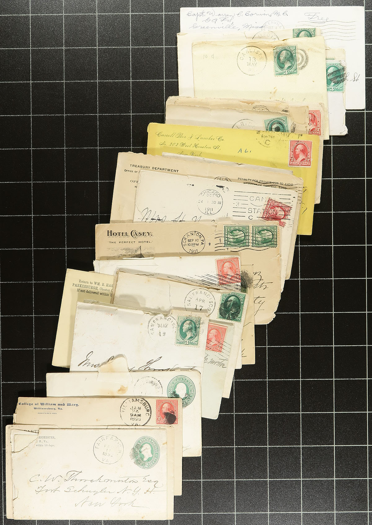 Accumulation of roughly 500 covers in a box, the vast majority being first day covers ranging from the 1940's to the 1980's, noting some private cachets, along with event covers, space covers, commercial covers (many from from the 1870's franked with the 3c Washington (Banknote perhaps) issue, paying the domestic rate), postal stationery, etc. A nice group for the cover collector, a few faults mostly with the commercial mail, overall fine to very fine. Estimate =