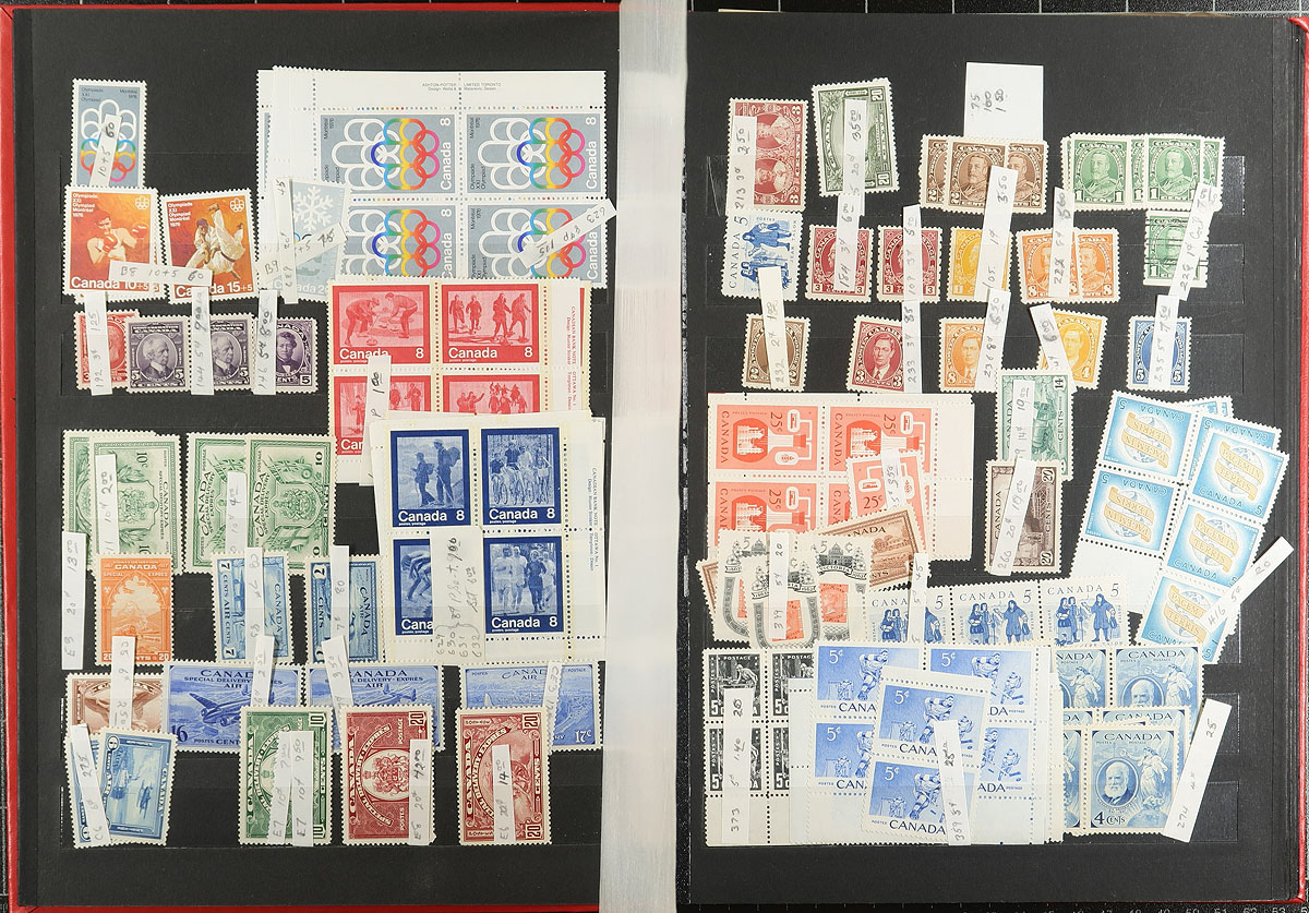 A bankers box with the balance of an estate in an assortment of albums, stockbooks and a good handful of loose pages, cards. Most of the collections are partial segments with some going back to #15 and others running into the 1990's. Some are mint, some are used, some are both. Some are collections, others were more "stock-like". We did see some higher cataloguing singles (e.g. Bluenose, 15c QV Jubilee) and there are a couple of jumbles of mint blocks that have potential. There could be some interesting cancels. A moderate amount of duplication is to be expected, as this material is from various sources. Some "back of the book" is scattered throughout. Estimate =