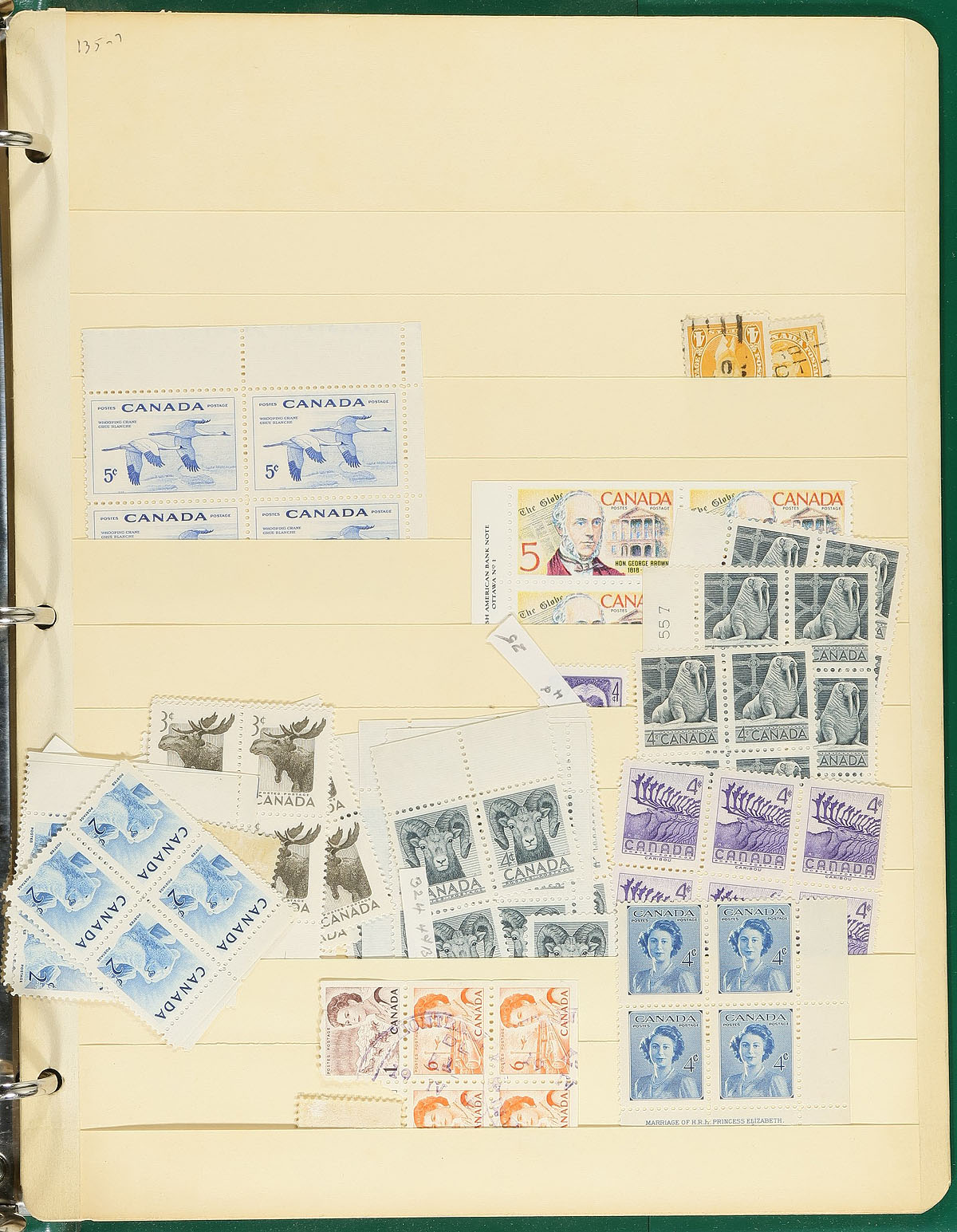 A bankers box with the balance of an estate in an assortment of albums, stockbooks and a good handful of loose pages, cards. Most of the collections are partial segments with some going back to #15 and others running into the 1990's. Some are mint, some are used, some are both. Some are collections, others were more "stock-like". We did see some higher cataloguing singles (e.g. Bluenose, 15c QV Jubilee) and there are a couple of jumbles of mint blocks that have potential. There could be some interesting cancels. A moderate amount of duplication is to be expected, as this material is from various sources. Some "back of the book" is scattered throughout. Estimate =