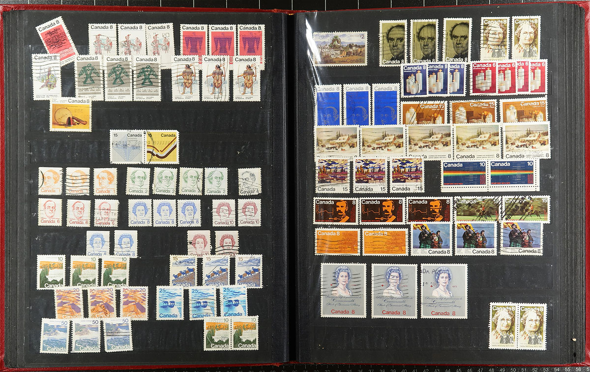 A bankers box with the balance of an estate in an assortment of albums, stockbooks and a good handful of loose pages, cards. Most of the collections are partial segments with some going back to #15 and others running into the 1990's. Some are mint, some are used, some are both. Some are collections, others were more "stock-like". We did see some higher cataloguing singles (e.g. Bluenose, 15c QV Jubilee) and there are a couple of jumbles of mint blocks that have potential. There could be some interesting cancels. A moderate amount of duplication is to be expected, as this material is from various sources. Some "back of the book" is scattered throughout. Estimate =
