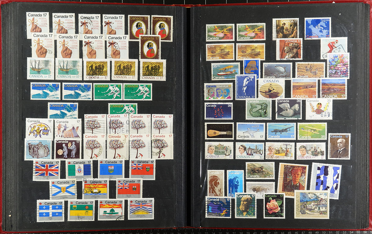 A bankers box with the balance of an estate in an assortment of albums, stockbooks and a good handful of loose pages, cards. Most of the collections are partial segments with some going back to #15 and others running into the 1990's. Some are mint, some are used, some are both. Some are collections, others were more "stock-like". We did see some higher cataloguing singles (e.g. Bluenose, 15c QV Jubilee) and there are a couple of jumbles of mint blocks that have potential. There could be some interesting cancels. A moderate amount of duplication is to be expected, as this material is from various sources. Some "back of the book" is scattered throughout. Estimate =