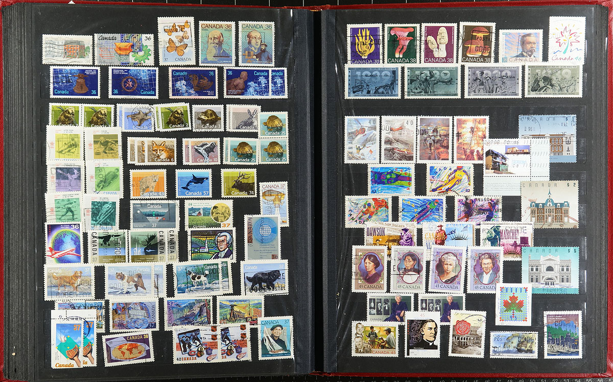 A bankers box with the balance of an estate in an assortment of albums, stockbooks and a good handful of loose pages, cards. Most of the collections are partial segments with some going back to #15 and others running into the 1990's. Some are mint, some are used, some are both. Some are collections, others were more "stock-like". We did see some higher cataloguing singles (e.g. Bluenose, 15c QV Jubilee) and there are a couple of jumbles of mint blocks that have potential. There could be some interesting cancels. A moderate amount of duplication is to be expected, as this material is from various sources. Some "back of the book" is scattered throughout. Estimate =